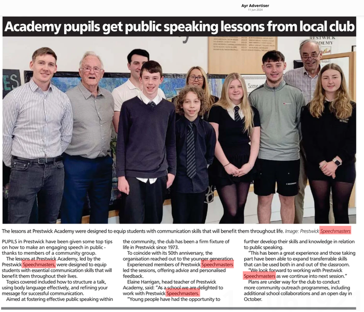 The club goes back to 1954 under the name of Prestwick Toastmasters Club and was renamed the Prestwick Speechmasters Club in 1973.